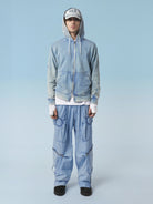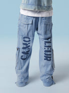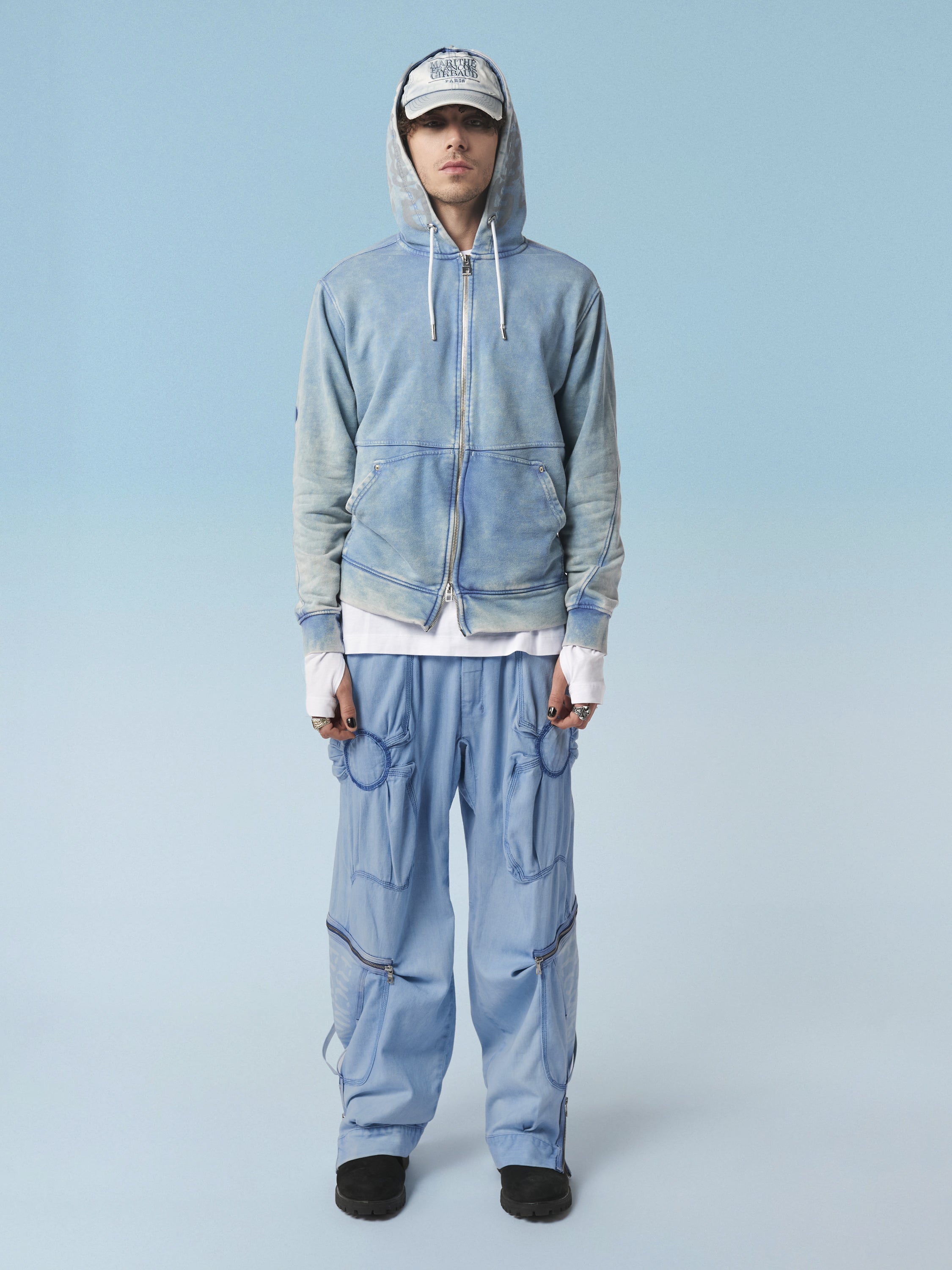 The lines of these M+FG baggy pants evoke the statues of Easter Island—wide, expressive, like the face of a statue appearing along the leg. A zipped mouth, a "pocketed" nose, a rounded, topstitched eye. Its generous volume and six pockets provide comfort suited to all body types.