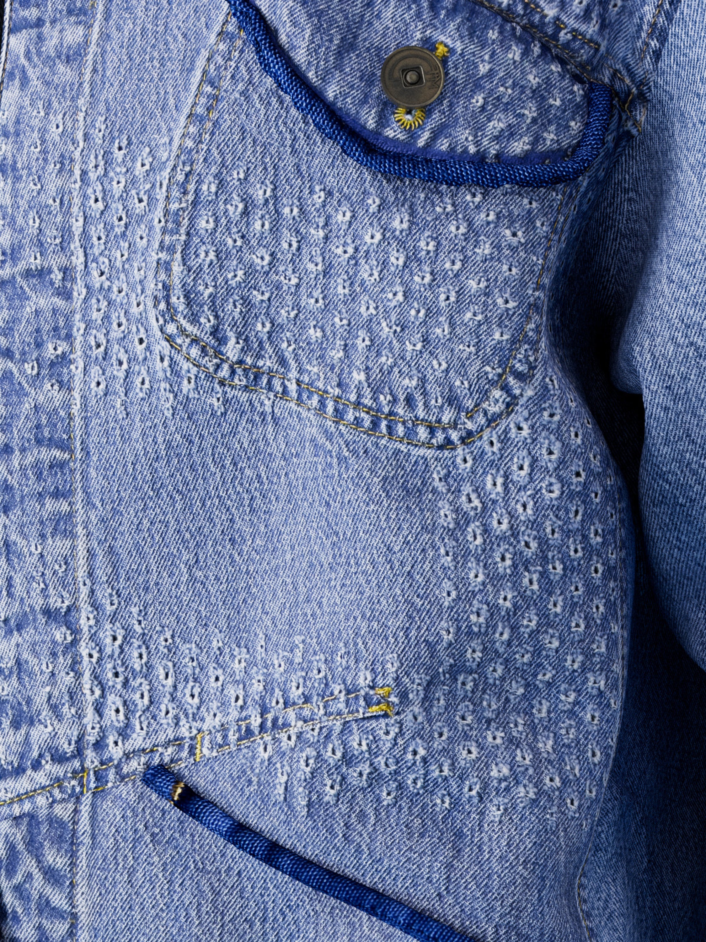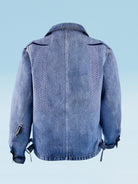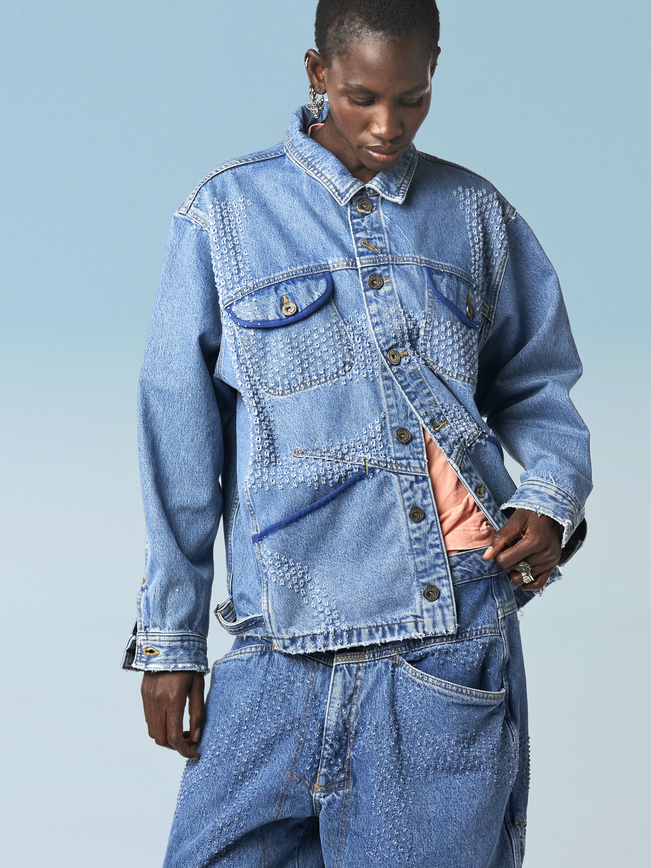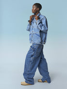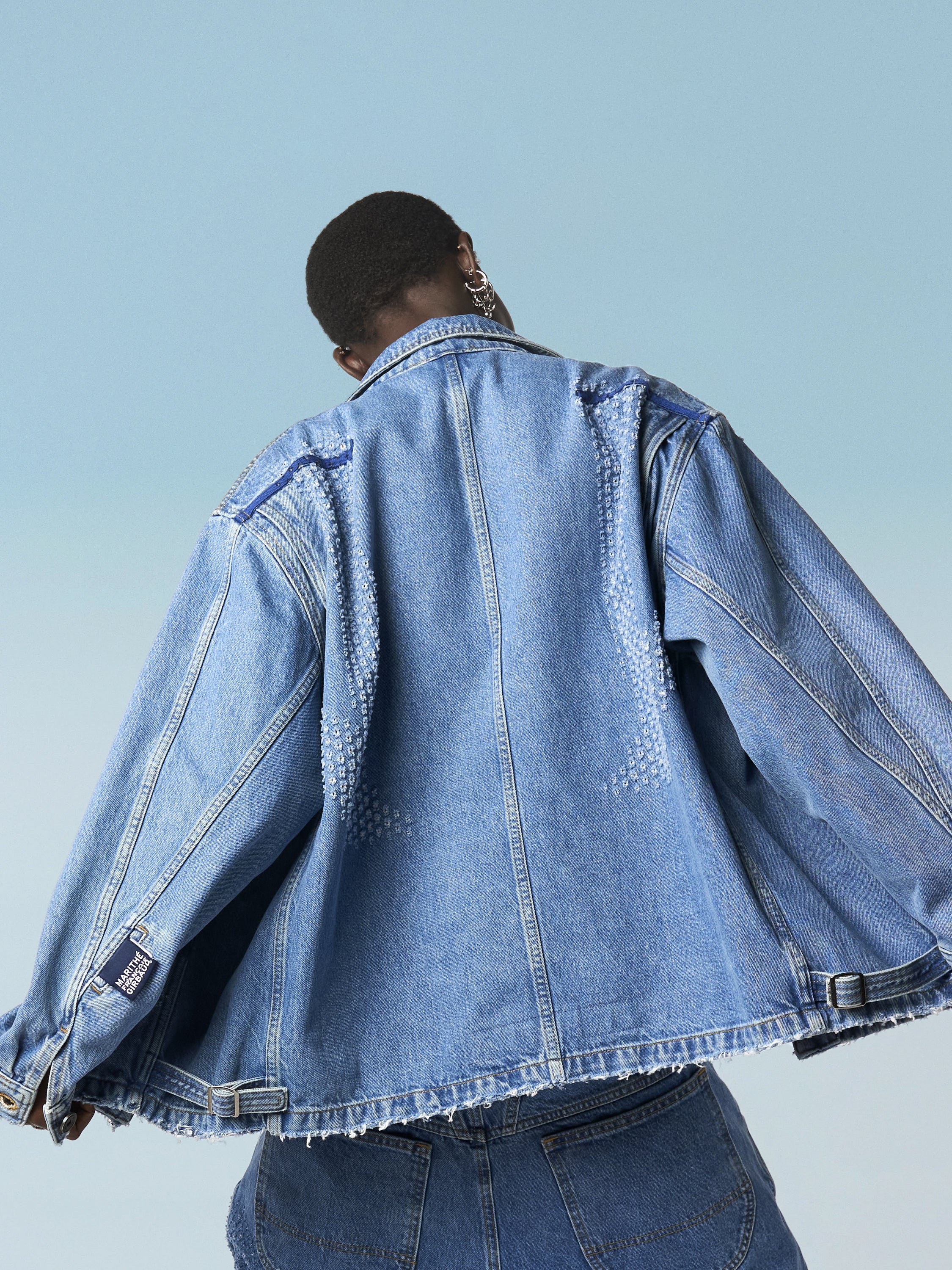 The Maskix denim work jacket stands out with its two chest patch pockets, two sculpted "Dungarees" pockets featuring an X Construction design, and adjustable tabs at the hem. The metal buttons are engraved with the MFG monogram. The new Tear-Off Label on the left sleeve, which can be shown, hidden, or even removed, has become the focal point of the brand's latest Internwear line: WEAR IT IN, WEAR IT OUT, or TEAR IT OFF.